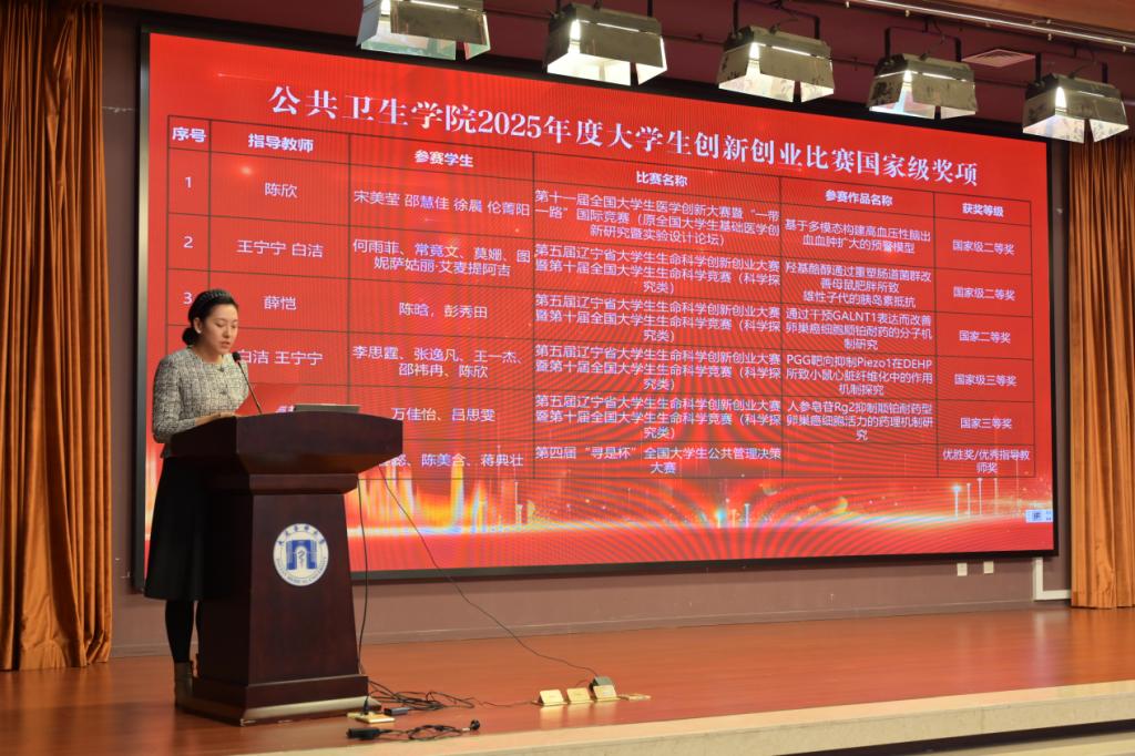 学生代表宋美莹、何雨菲、王春懿、刘思彤、安重瑾上台分享了参赛经历与感悟,展现了公共卫生学子勇于探索、敢于突破的风采。