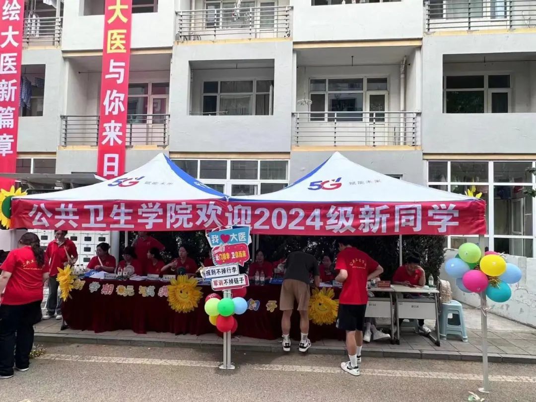 当晨曦照耀在大医的校园时,早已布置起的迎新现场便迎来了第一批满怀期待的新生与家长。横幅高挂,彩旗飘扬,“星汉灿烂迎新季,大医公卫欢迎你”的标语在阳光下显得格外醒目,仿佛用最热情的姿态欢迎每一位新成员的到来。