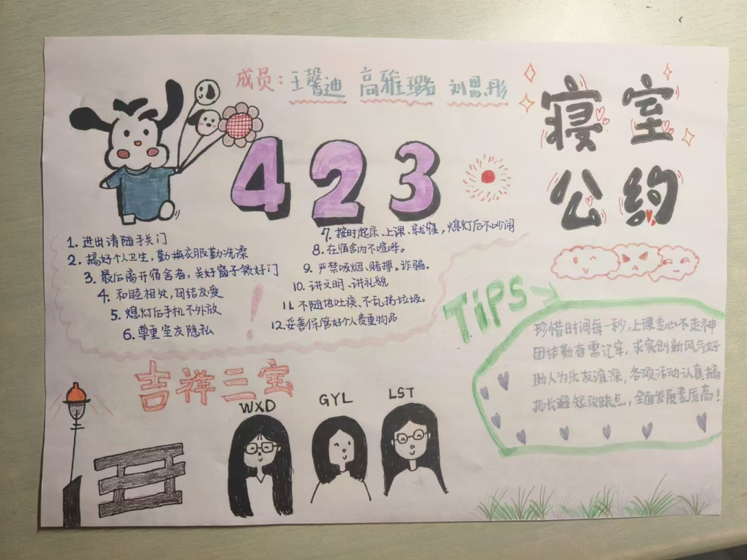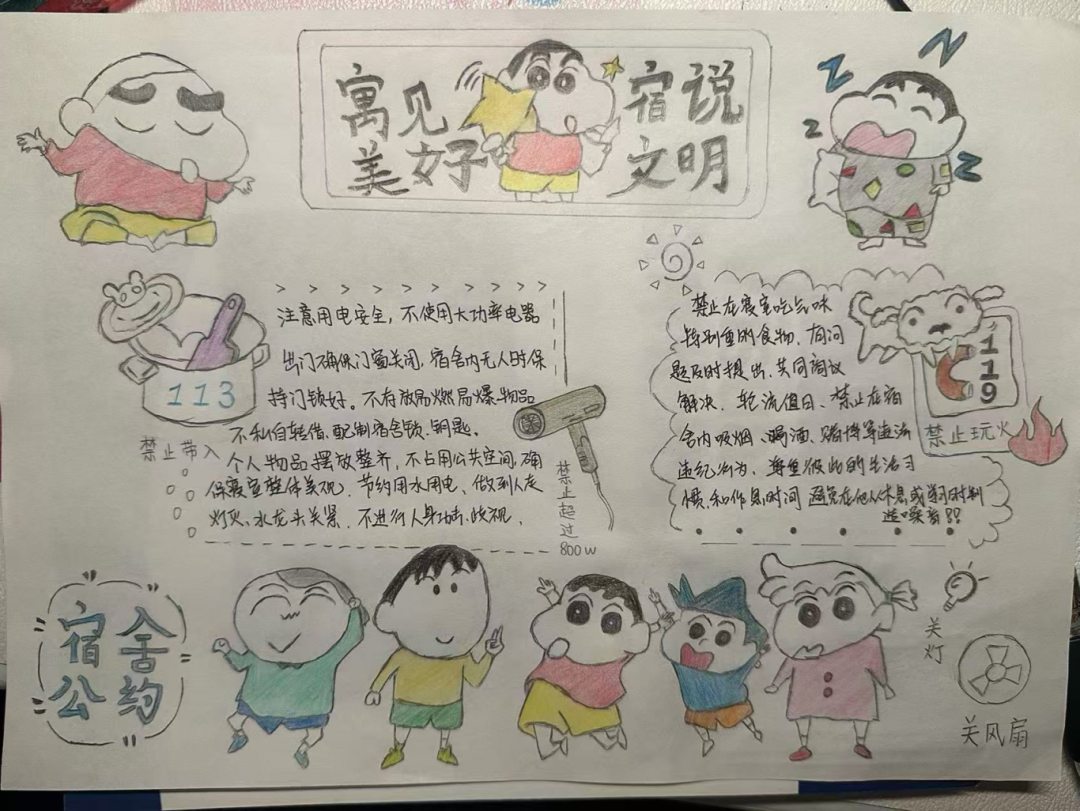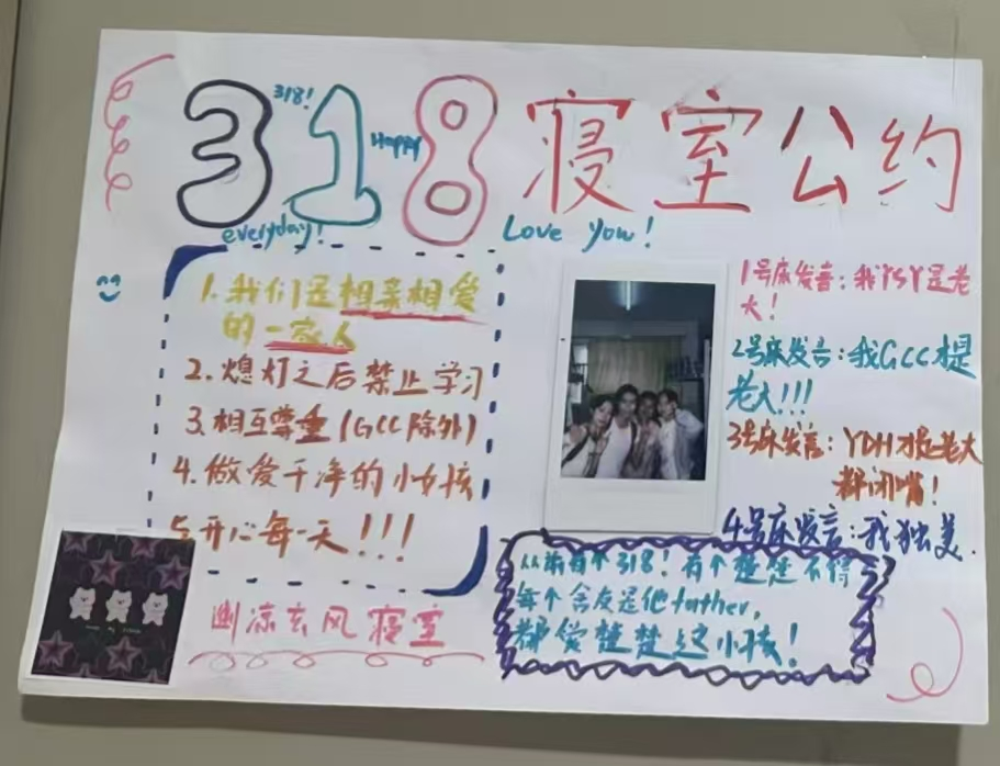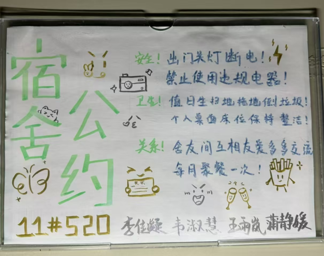 此次活动由生活权益部主办。活动旨在通过寝室商讨设计的形式,激发同学们的创新思维,增进室友间的相互了解与合作。活动要求寝室成员共同设计A4纸张大小的寝室公约,内容需涵盖作息时间、卫生保持、公共设施使用等多个方面。活动过程中,为确保公约内容明确、易于寝室成员遵守,参赛寝室纷纷发挥创意,首先将公约结果整理成书面形式,并将公约贴于宿舍门上,拍照上传至指定邮箱。随后,生活权益部成员根据寝室设计的创意性、实用性以及公约的合理性、可行性等方面进行综合评分,最终评选出了一批优秀寝室公约作品。在大家积极热情的参与之下,此次活动圆满结束。