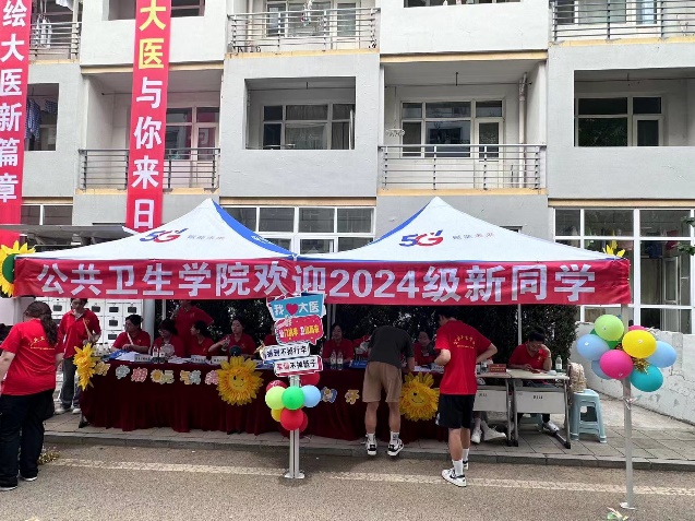 当晨曦照耀在大医的校园时,早已布置起的迎新现场便迎来了第一批满怀期待的新生与家长。横幅高挂,彩旗飘扬,“星汉灿烂迎新季,大医公卫欢迎你”的标语在阳光下显得格外醒目,仿佛用最热情的姿态欢迎每一位新成员的到来。