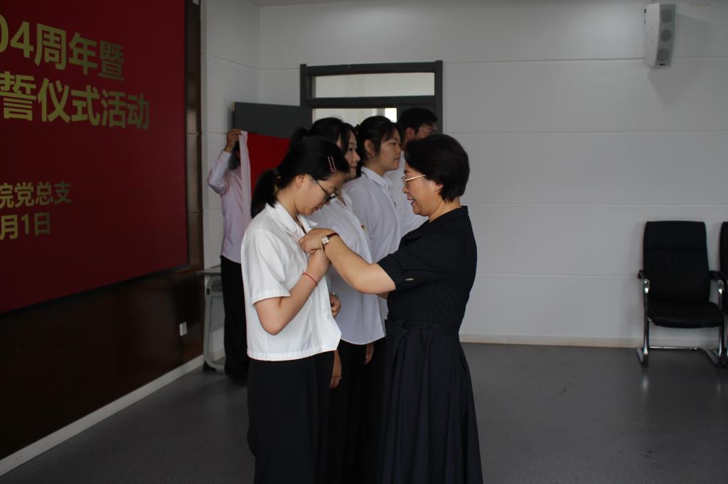 宣誓仪式在庄严的《国际歌》中拉开序幕。杨晓丽为新发展党员佩戴党员徽章,鼓励同学们不负时代、不负韶华,在新时代新征程上展现新担当、实现新作为。新党员面向党旗高举右拳,庄严宣誓。铿锵誓言表达了忠诚于党、为共产主义奋斗终身的决心。
