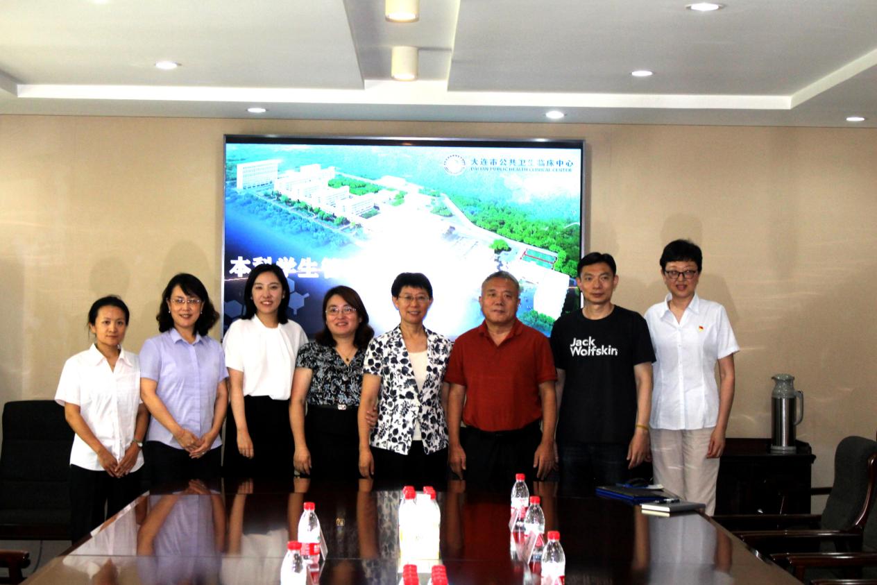 在大连市公共卫生临床中心,党委书记孙梅、院长路希维、副院长赵亮、科教部部长宁晓艳、科教部李璇、主任中医师周伟和本科实习生出席座谈会。